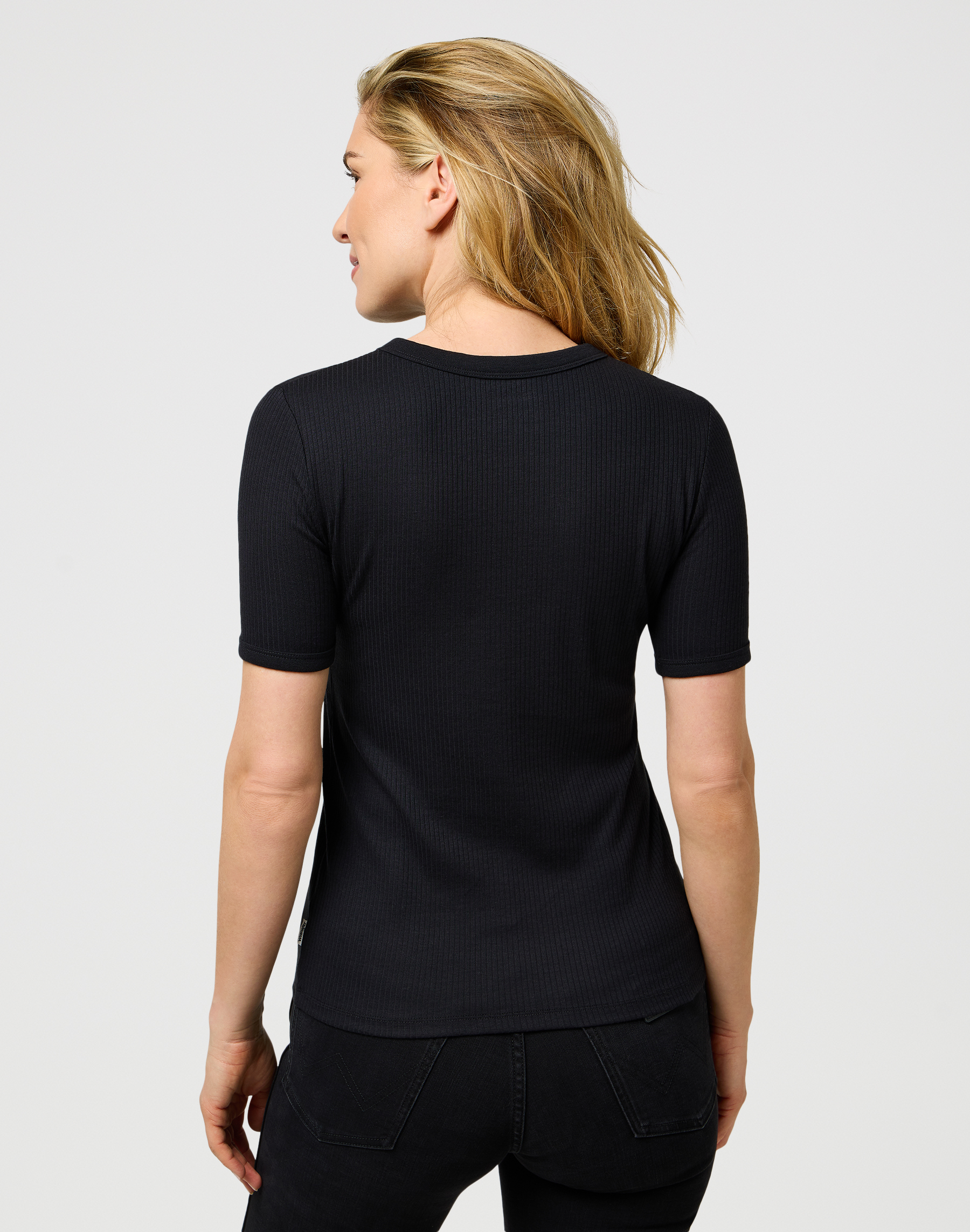 - חולצת טי קלאסית עם טוויסט – משלבת גזרה נשית מחמיאה עם מפתח כפתורים עדין וסיומת ריב אלסטית למראה מחודד ועדכני.