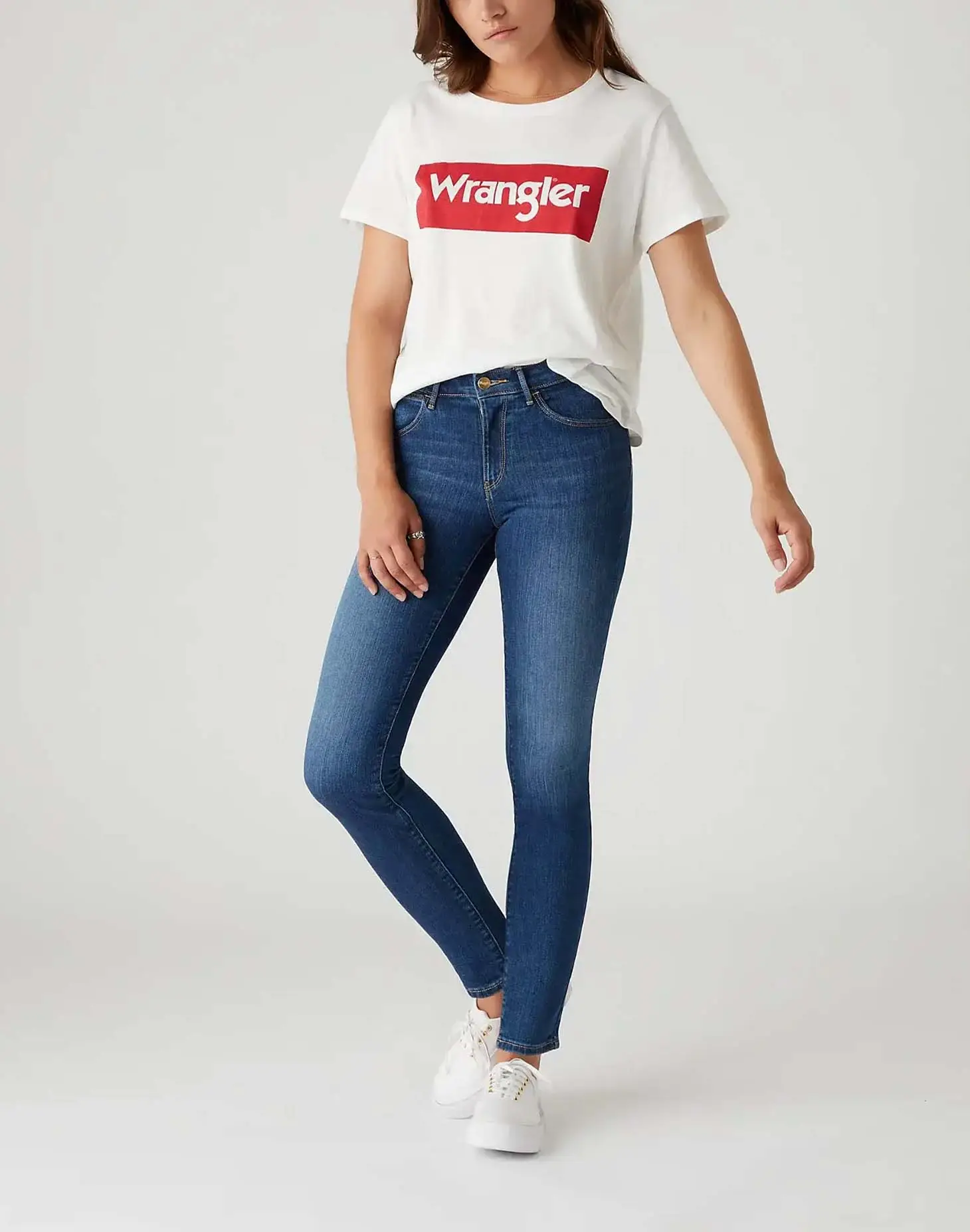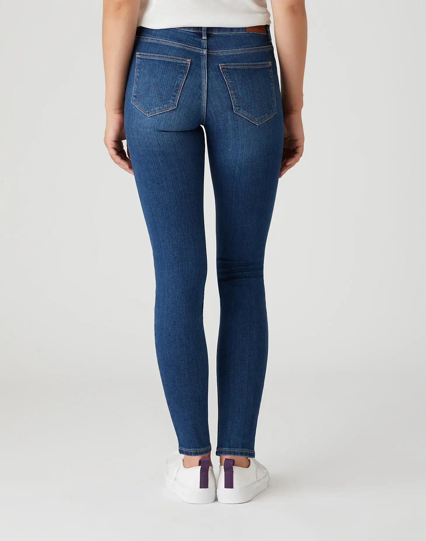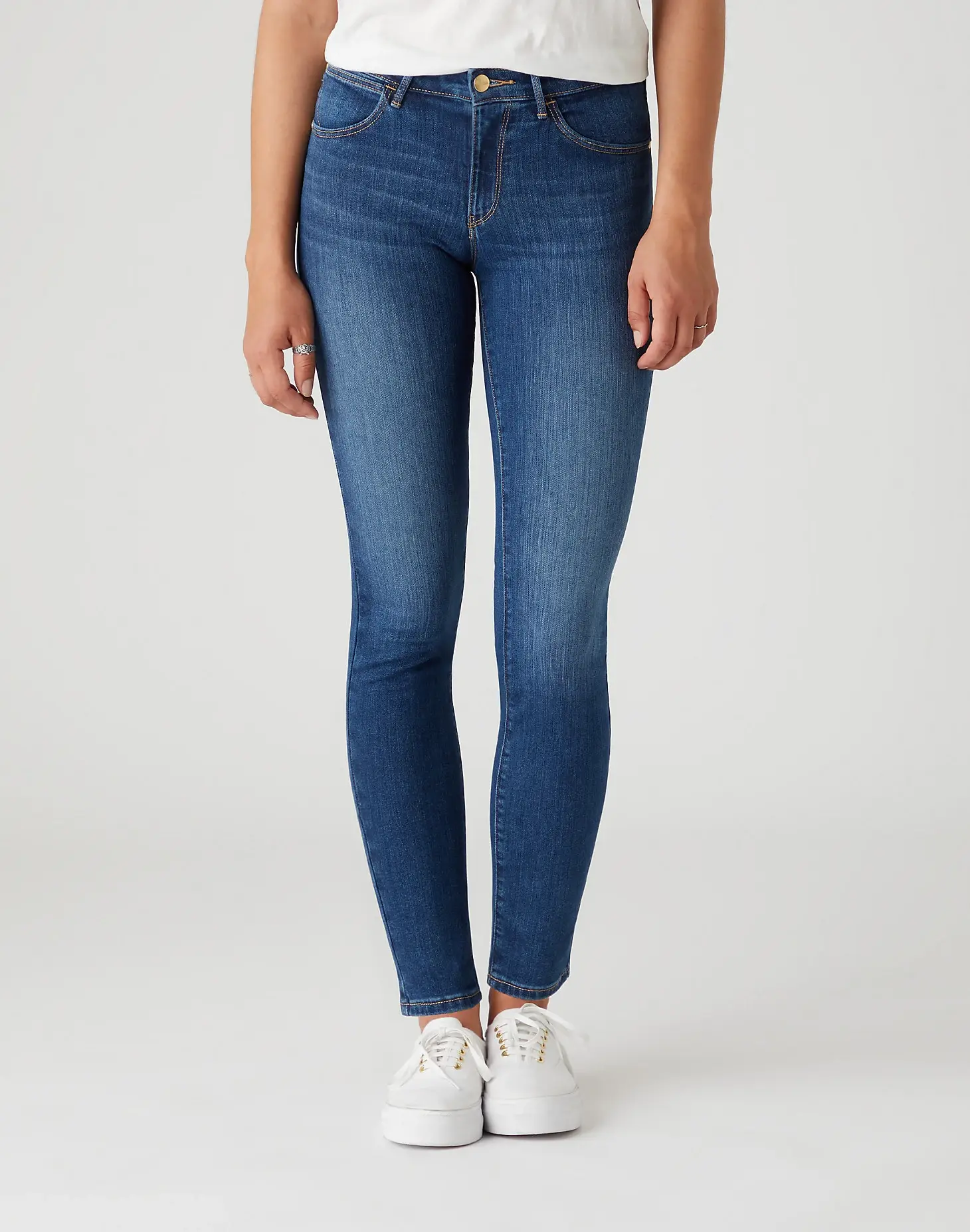 Crafted from high stretch, mid blue denim with a mid rise waist and skinny fit from hip to ankle.